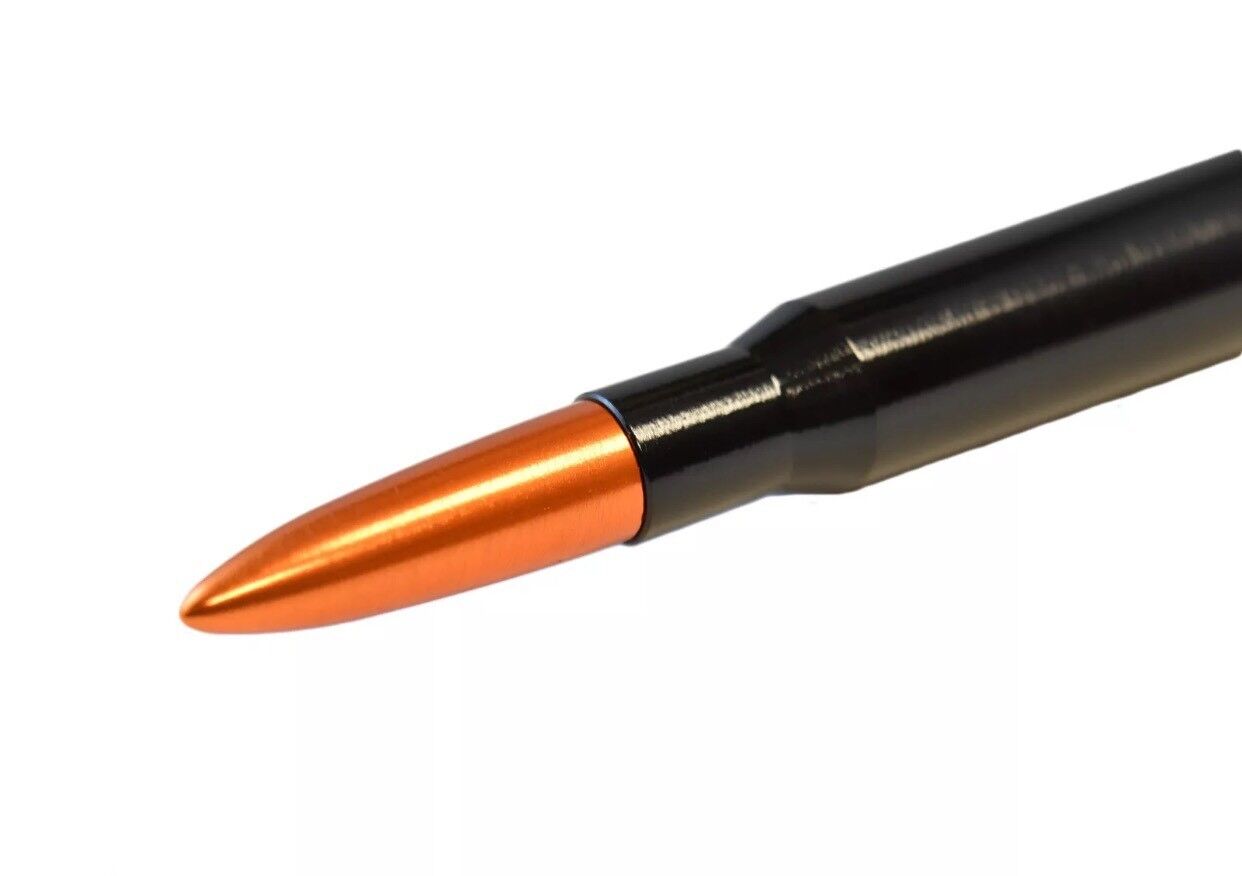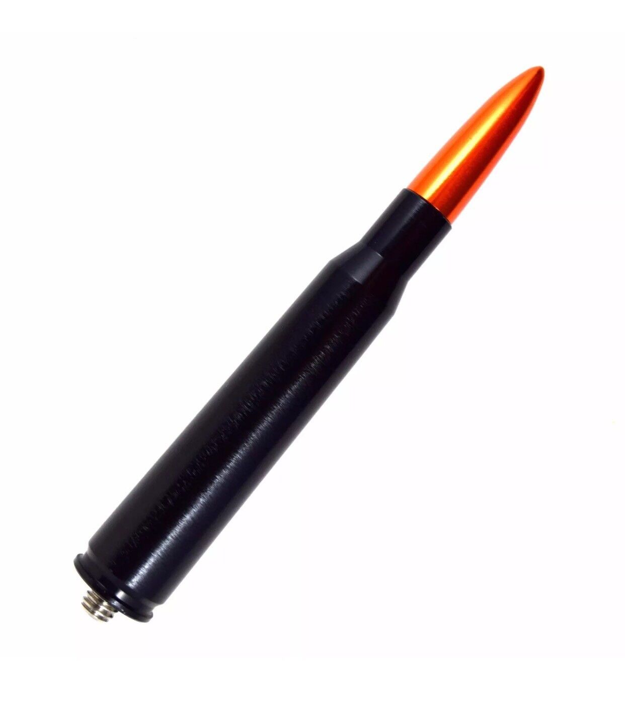 Replace your factory antenna with this stylish yet functional Black with Orange tip 50 Caliber Ammo Style Antenna. Made out of T-6061 Billet Aluminum with a hard Black anodized finish that will not chip, scratch or fade over time.